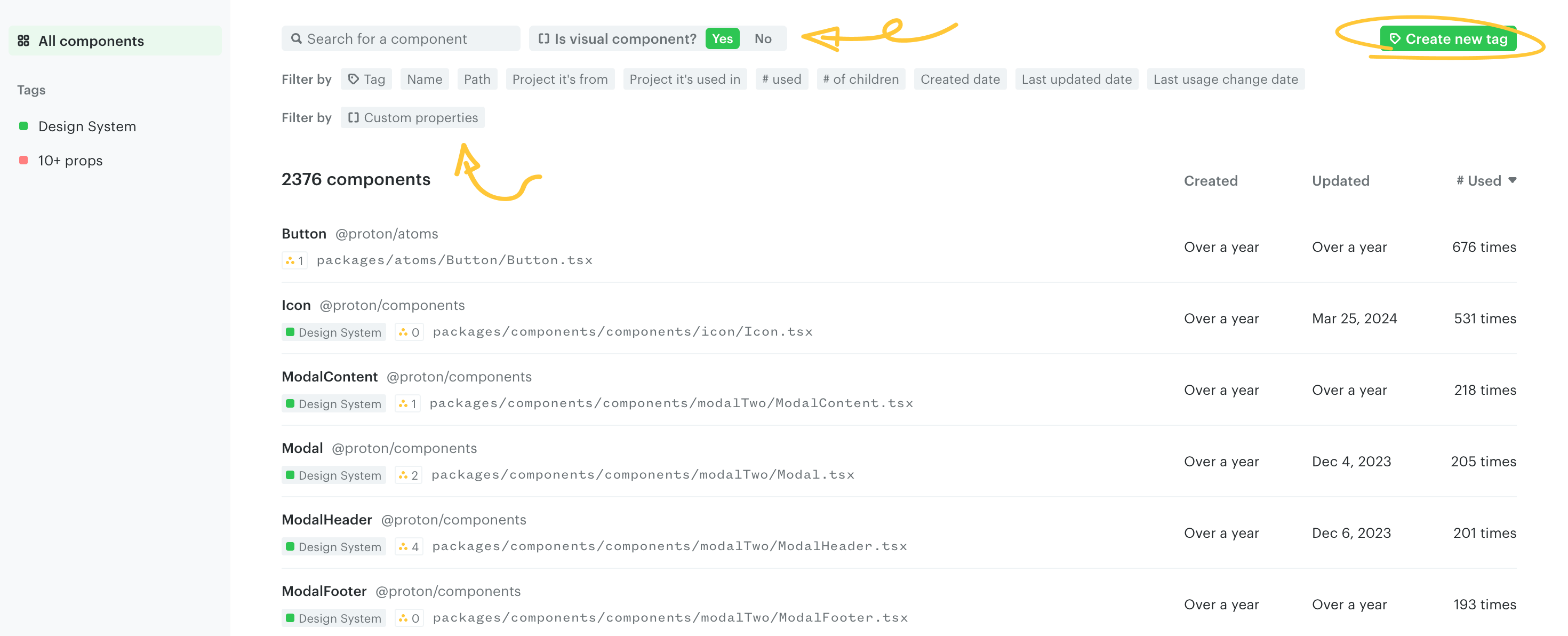 Once you're happy with a filtered view, you can tag all the components in the filtered list using the "Create new tag" button. Then, you can use this tag in your custom charts to analyze the usage of these components. Learn more: [use-tags-for-custom-analyses](https://docs.omlet.dev/cli-and-dashboard/components/use-tags-for-custom-analyses "mention")
