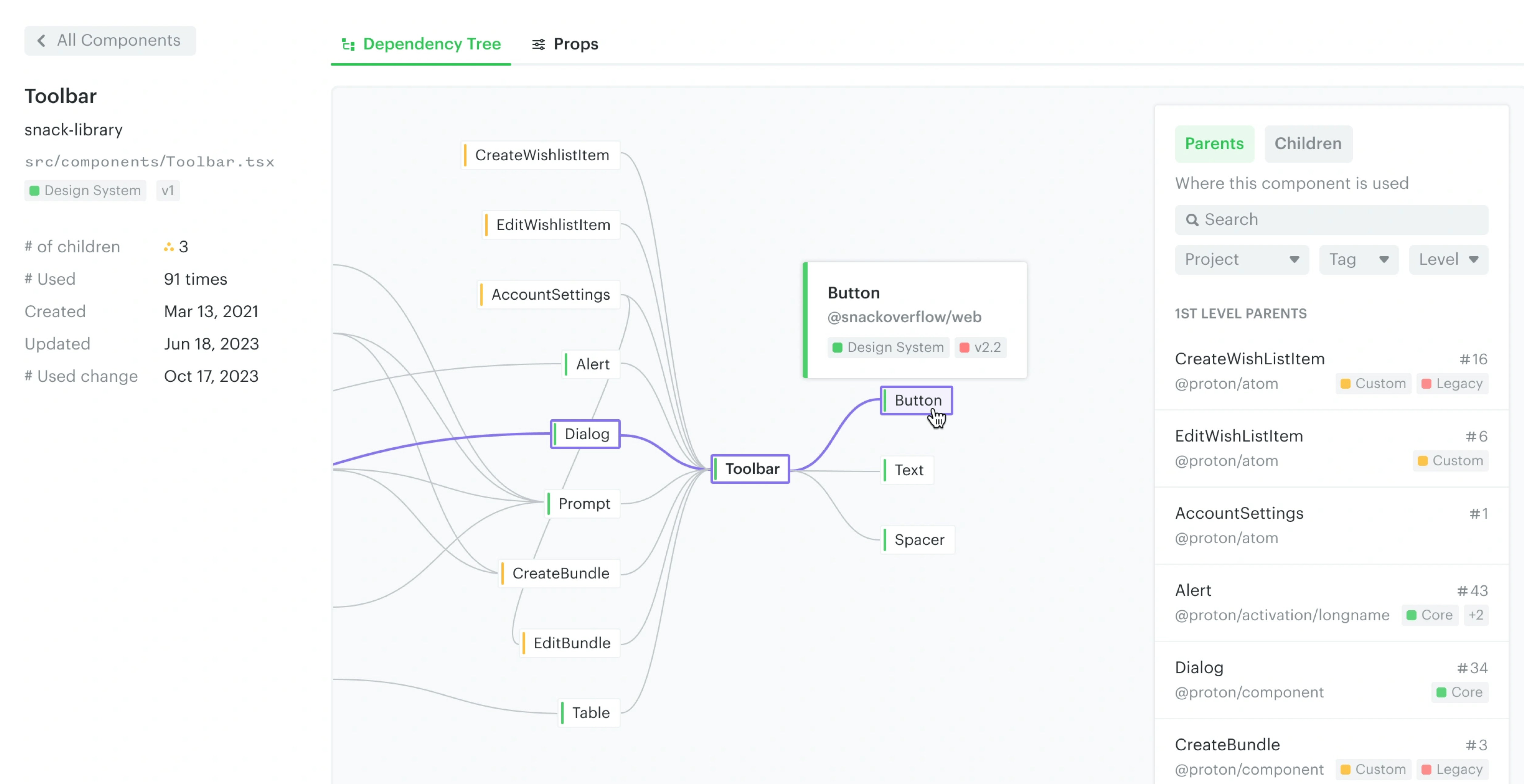 The "Props" tab gives your team insights to make decisions on what to add, remove, or adjust in your design system. From there, you can click on a prop to drill down its variables and select the "List usages" button. This will show you where and how the variables of that prop are used in your codebase.