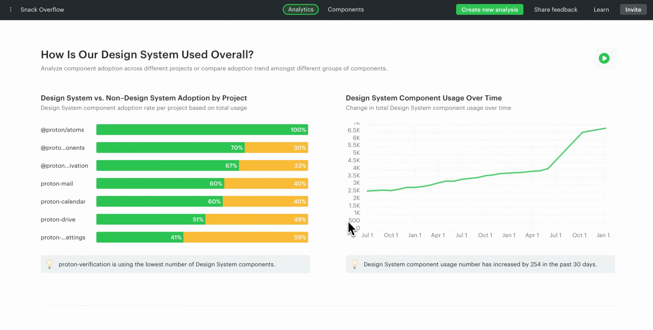 The first chart shows you the overall adoption over time. Since this is your first scan, you'll only see the information for today. It will expand when you upload more scans with CLI. Hop in and explore the analytics page. Other charts here will also give you [insights into your design system](#user-content-fn-1)[^1].
