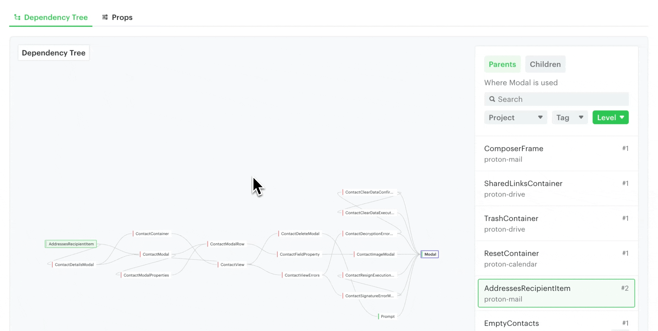 Omlet lists all the components scanned from your repositories on the "Components" page. When you click on a component, you'll see its "parent" and "child" components from the Dependency Tree. This allows you to see an overview of which components will be affected if you make changes to a specific component.